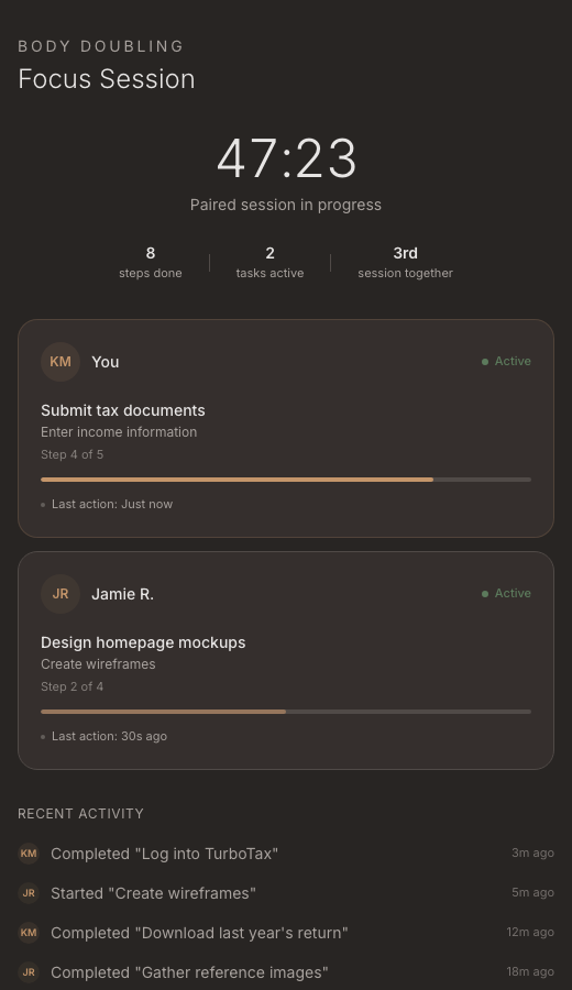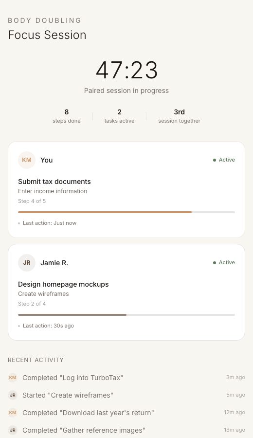 The plan was never the problem. Every productivity app you’ve tried solves the wrong half of the issue. They help you organize, prioritize, break things into steps and more. But then they leave you alone during the part that actually matters: doing it.