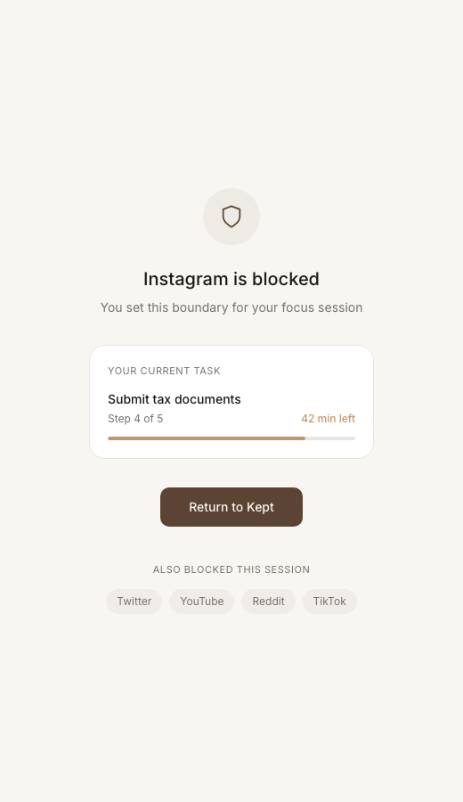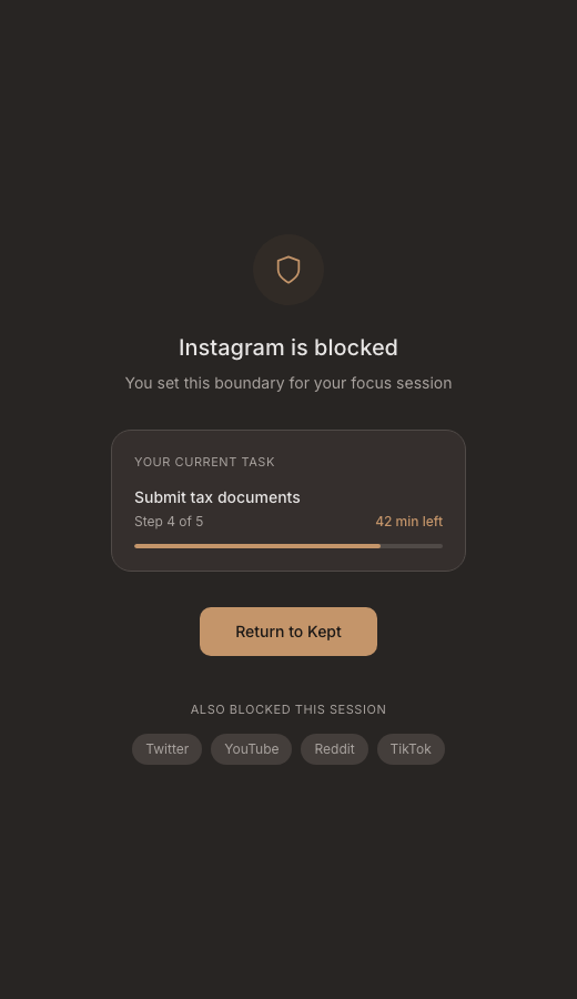 Your brain responds completely differently to a task you’re inside versus one you’re still avoiding. Once the loop is open, you want to close it. The hardest part was always starting, and Kept just made that part effortless.